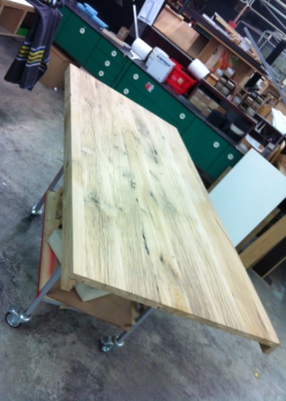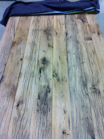 De opdrachtgever leverde mij een afbeelding aan van een tafel dat hen aansprak. Een vergelijkbare tafel wilde zij gemaakt hebben van eikenhout wat zij al hadden. Echter bleek dit hout doorzeeft met gaten van de houtworm. Hierdoor was dit niet meer bruikbaar. Als alternatief ben ik opzoek gegaan naar hout wat ze aan zou spreken. Via een hout handel in monumentale bouwmaterialen ben ik bij Eiken wagon planken uit gekomen. De balken waren 80 jaar oud Frans eiken. Deze zijn millimeter voor millimeter afgeschaafd om de juiste tekening in het hout te krijgen en het lijnenspel op elkaar afgestemd te krijgen voordat er een blad van gemaakt is.