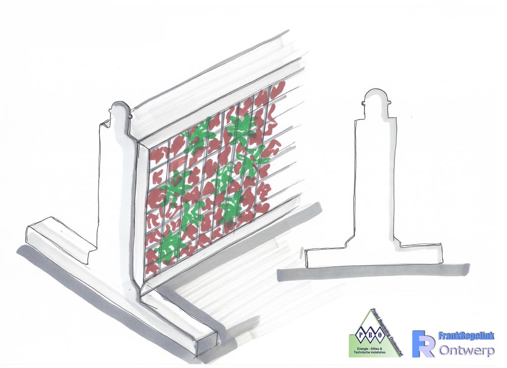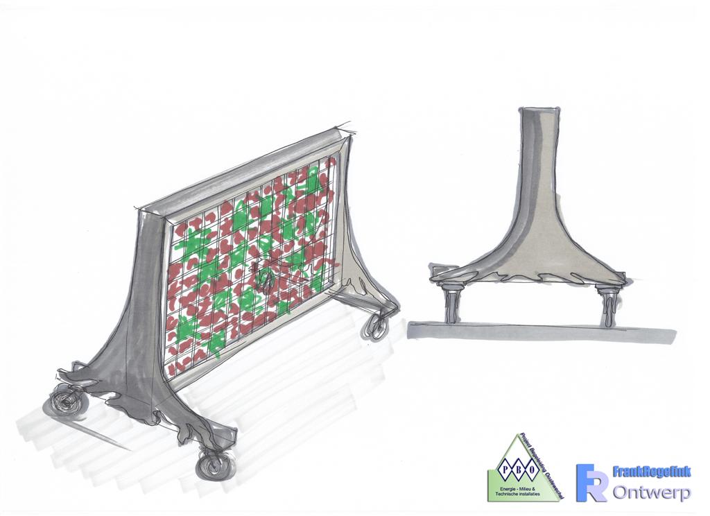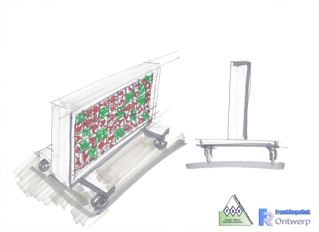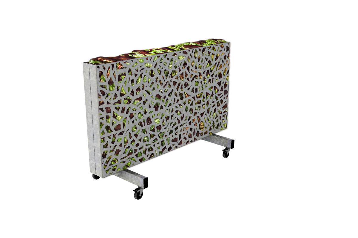 Dit scherm bestaat uit een metalen frame welke gevuld is met lava stenen. Deze stenen slaan overdag de warmte van de zon op. Hierdoor stralen de schermen ’s avond warmte uit zodat er nog aangenaam buiten gezeten kan worden. Ook houden lavastenen goed vocht vast. Door gebruik te maken van sedum planten in het scherm wordt dit vocht gebruikt door de sedum planten en ontstaat er een groen scherm.