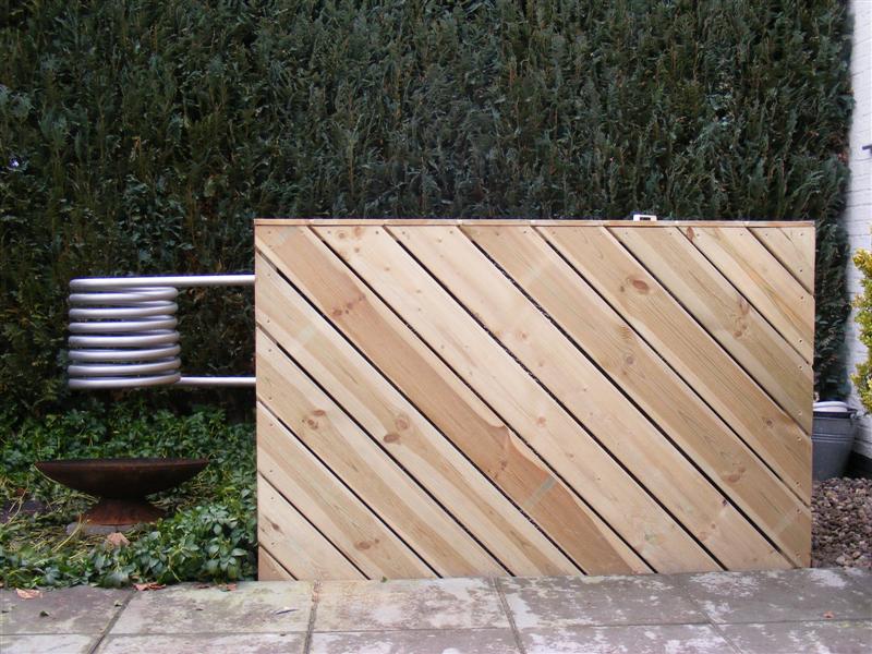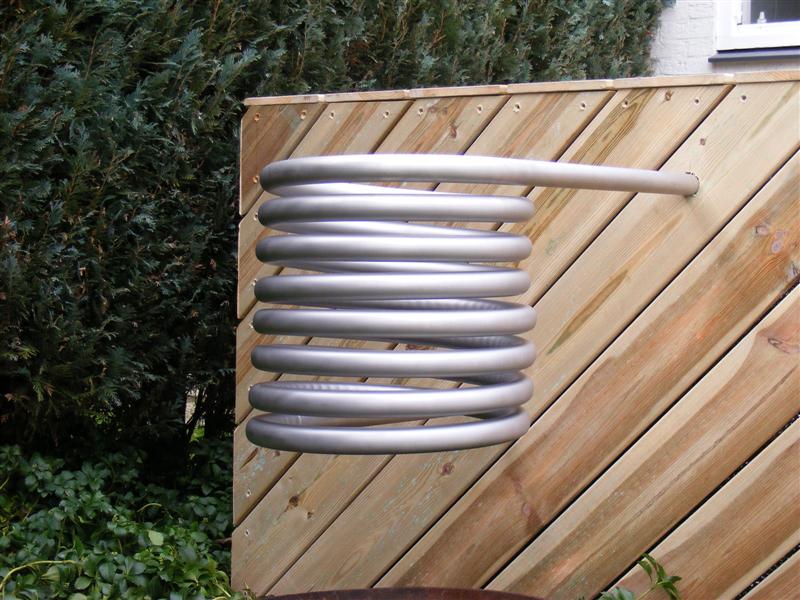 Het verwarmingselement is een 12 meter lange rvs buis. Door de warmte van het houtvuur wordt het water verwarmd. Door deze warmte stijgt het warme water omhoog in de spiraal. Hierdoor treedt er een natuurlijke circulatie op, en wordt het water verwarmd in het bad.