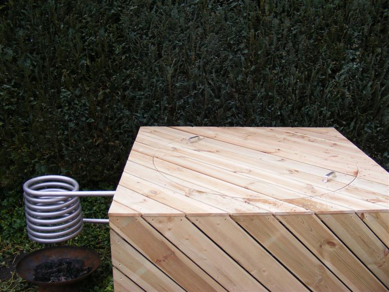 De kubus welke om de tank zit, is gemaakt van geïmpregneerd grenen. De planken zijn onder een hoek van 45 graden geplaatst zodat de lijnen over iedere zijde doorlopen in de bovenzijde van het bad en deksel.