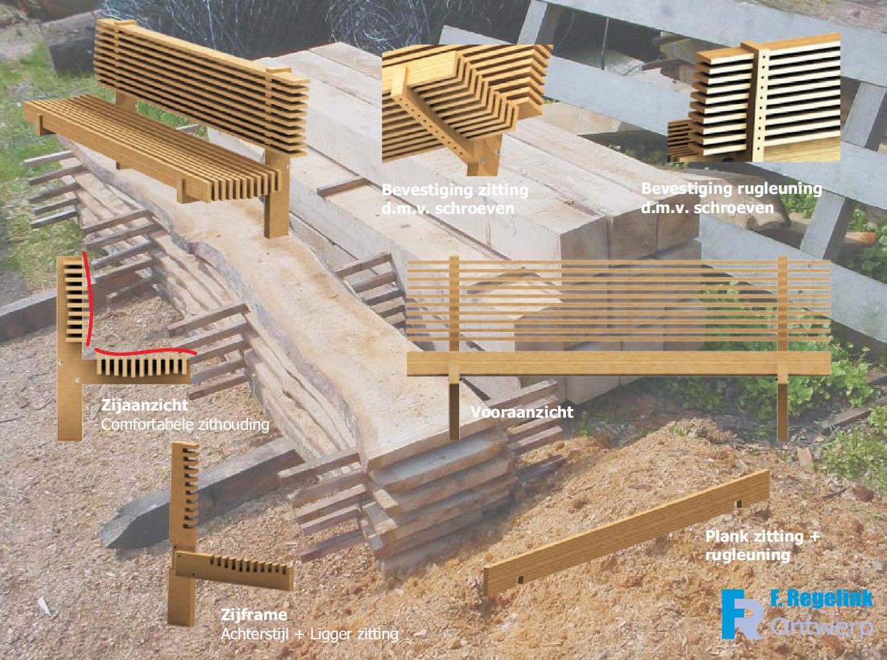 De zitting en rugleuning worden gemaakt van 100 x 20 mm gekantrecht eiken. De planken zijn 2000mm lang en hebben aan de onderzijde twee uitsparingen die gemakkelijk in de uitsparingen in het frame geschoven kunnen worden. Hierna kunnen de planken d.m.v. schroeven aan de onderachterzijde aan het frame bevestigd worden. De uitsparingen zijn in elke plank gelijk, hierdoor maakt het niet uit waar welke plank geplaatst wordt of deze nu voor de zitting of voor de rugleuning gebruikt wordt.